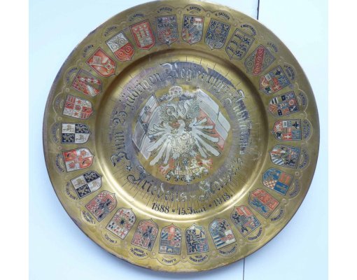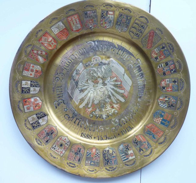 Obrovský talíř k 25 letům vlády císaře Wilhelma na německém trůnu / měděnný plech , známky poškotení - přesto mimořádný exponát s minimálním výskytem na trhu