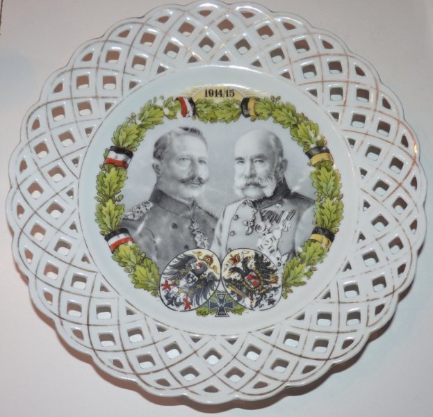 Ozdobný talíř s portrétem spojeneckých císařů Franz Josefa I. a Wilhelma II.