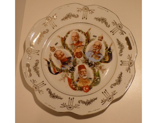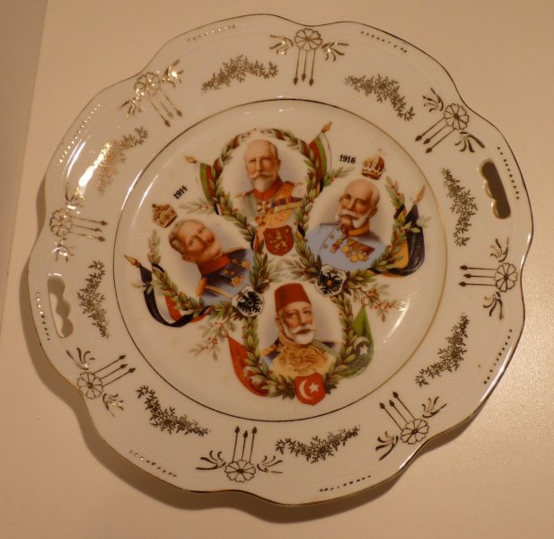 Talíř s portréty čtyř evropských panovníků začátku 20. století se zlatým dekorem
