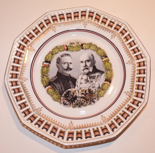 Talíř s vyobrazením císaře Franz Josefa I. a Wilhelma II. se znaky a stuhou.