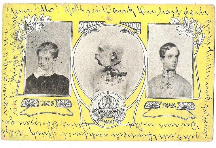 Trojportrét císaře Franz Josefa I. ztvárněný ve žlutém poli