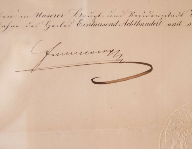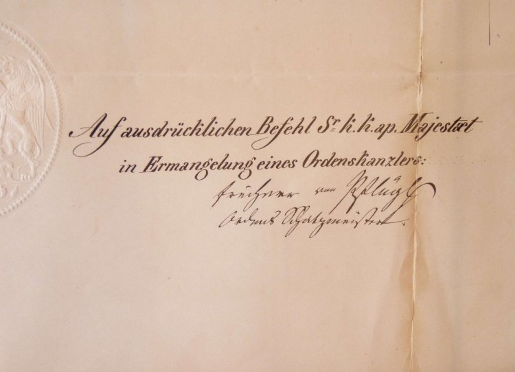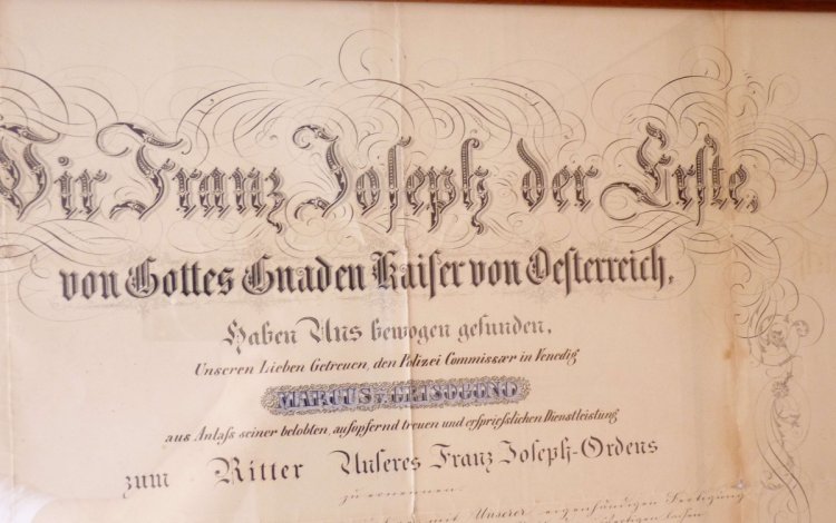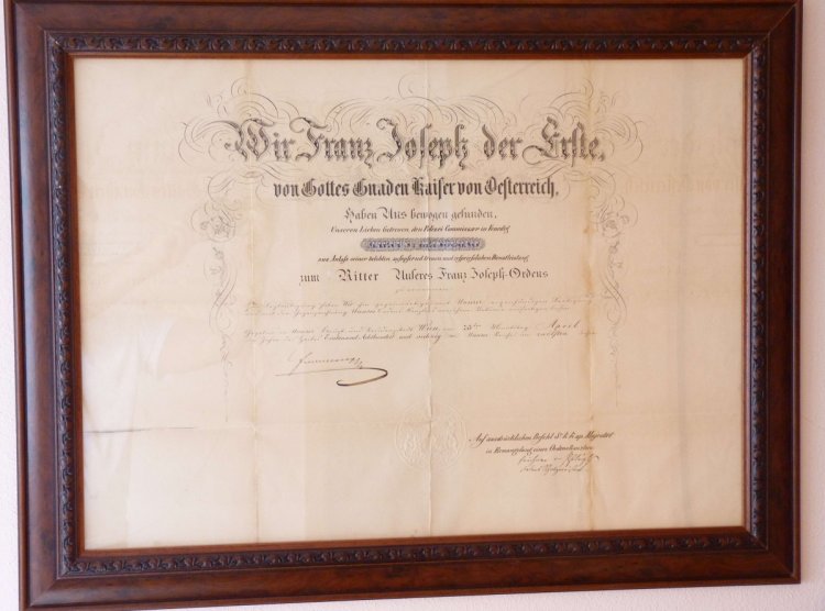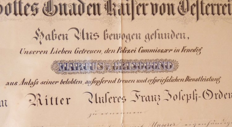 Udělovací listina na pergamenovém papíře - Řád Františka Josefa : pan - MARCUS v. GRISOGONO, s vlastnoručním podpisem Franz Josefa