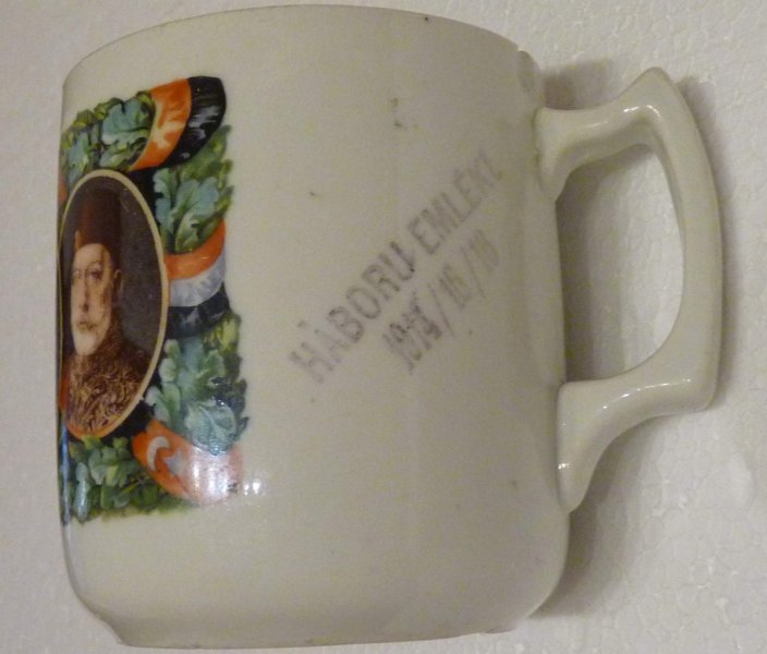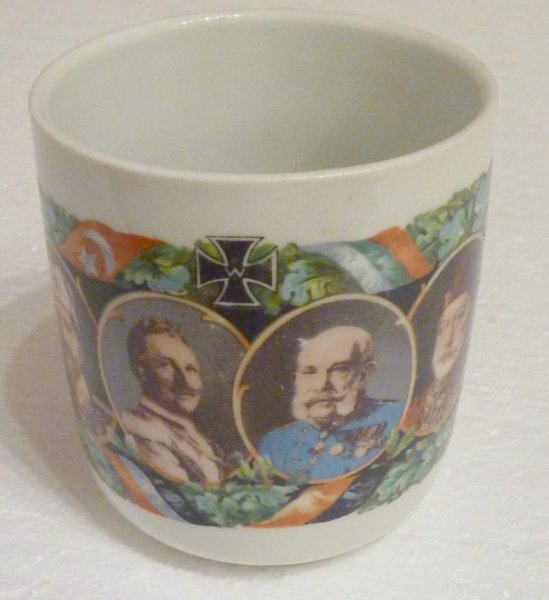 Uherská výroba hrnečku s portréty zástupců čtyřdohody - František Josef , Wilhelm , Mohamed a Ferdinand / vzácný hrneček