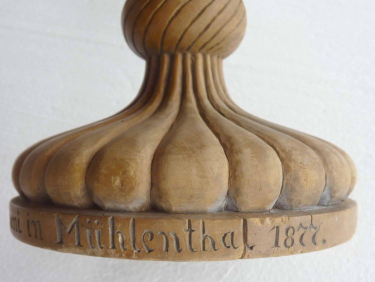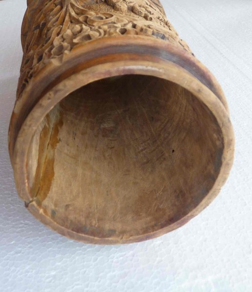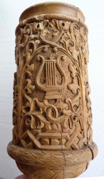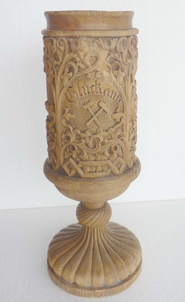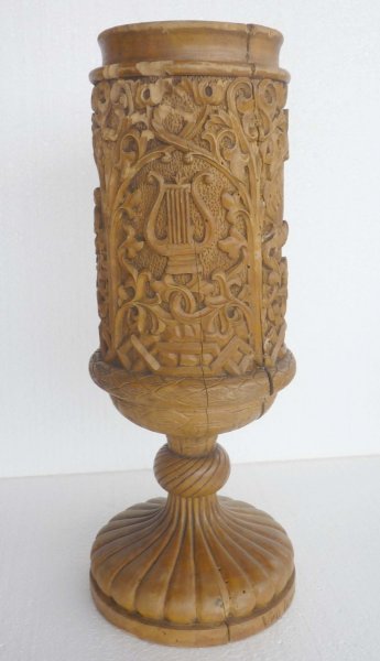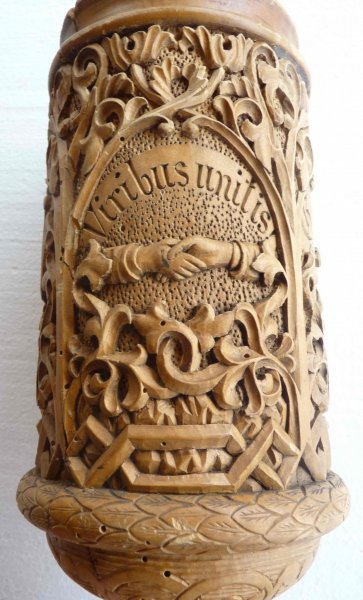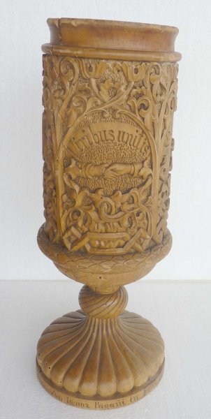 Dřevěný pohár - výjevy VIRIBUS UNITIS / hornictví / harfa - zřejmě hudební spolek / oslava a hold životu