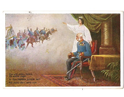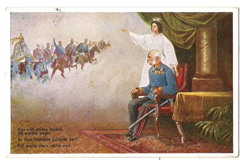 Válečná Můza ukazuje Františkovi Josefovi jásající armádu