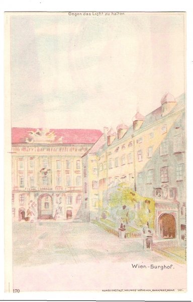 Malovaná kresba části Vídně- Burghof / proti světlu je vidět průsvit sedícího F.J.I.