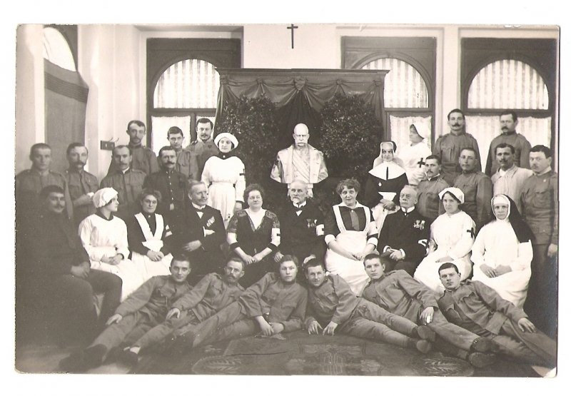 Vojenská nemocnice -Most,personál a zranění vojáci s bustou Franz Josefa I.
