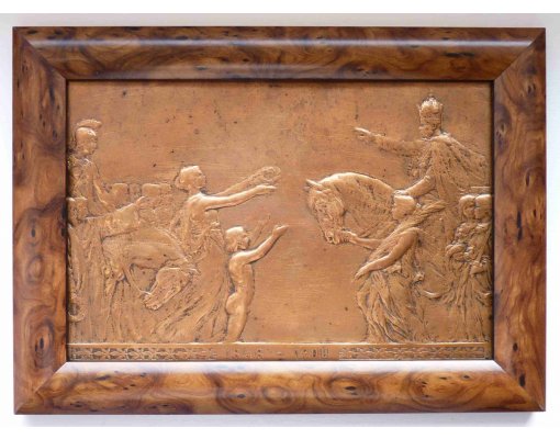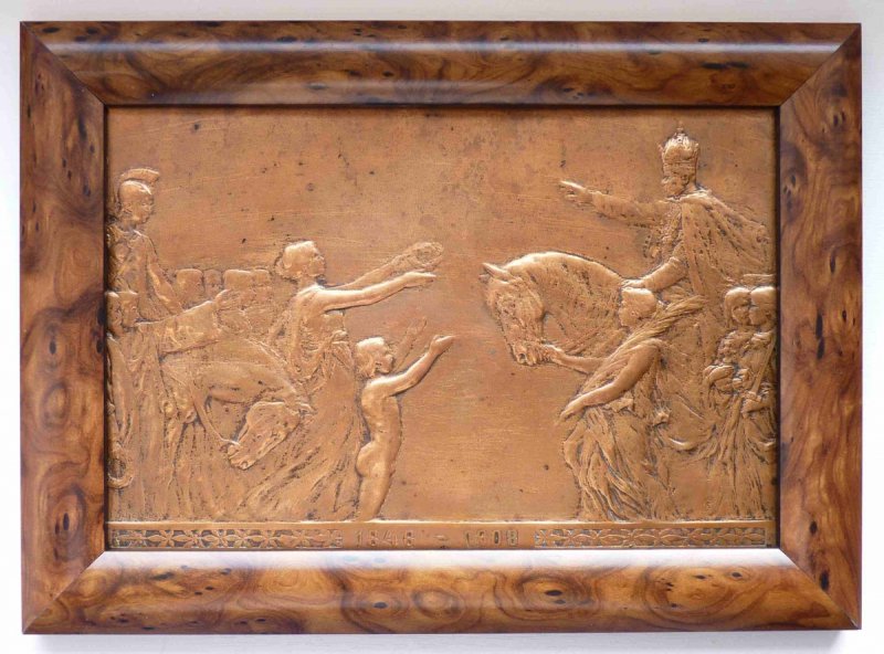Výlisek z plechu - měď / císař Franz Josef na koni a vítající lid
