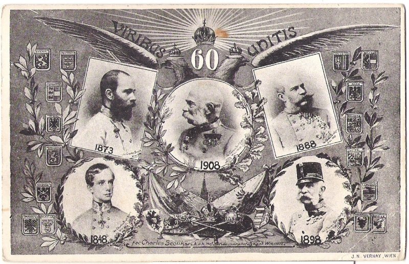 Víceportrét Franz Josefa I., výročí 60 let vlády (1848, 1873, 1888, 1898, 1908)