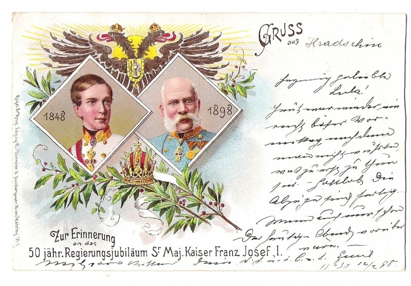 Barevná verze dvojportrétu Franz Josefa, využita k vládnímu výročí, r.1848 a r.1898