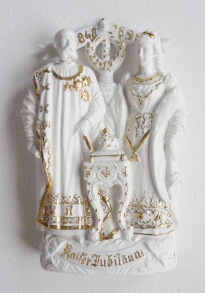 Soukromá porcelánka - Žacléř / sousoší Františka Josefa a Elisabety 1848 - 1898 , třetí exemplář v museu ( celkově chybějící horní praporec s letopočtem ) , vzácná položka + foto po rekonstrukci chybějící části + foto všech tří exemplářů v museu