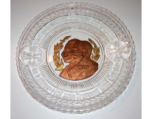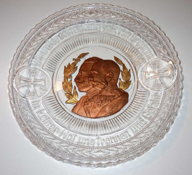 Zlacený skleněný talíř s portréty Wilhelma II. a Franz Josefa I. , vitrínová zachovalost