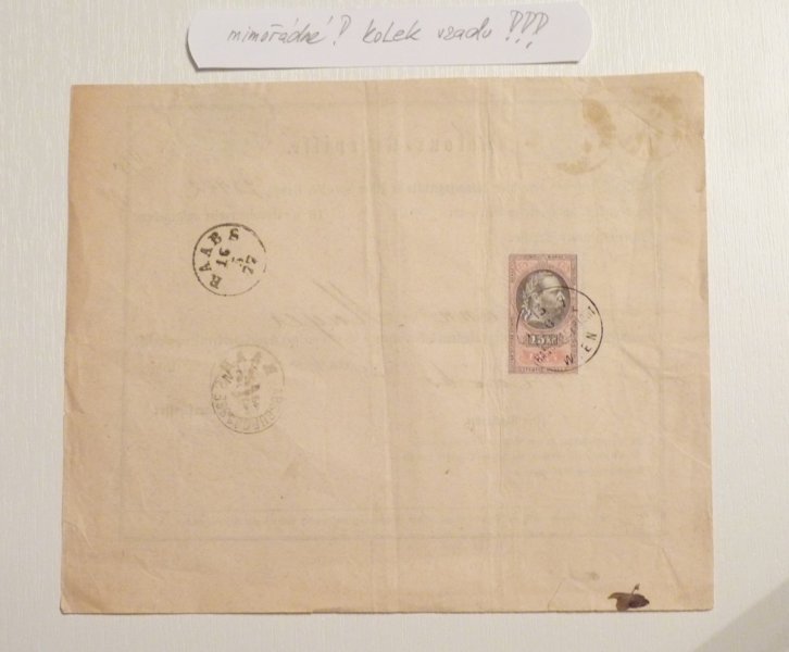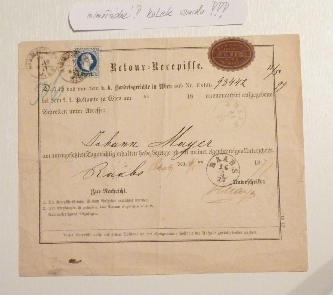 Zpáteční frankovaný recepis 10 Kr. známkou a 15 Kr. kolkem