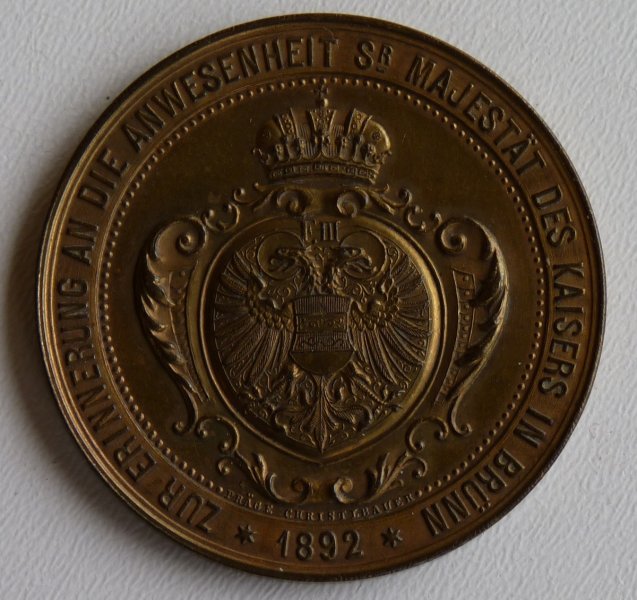 Medaile s portrétem císaře Františka Josefa - 1892 / na památku návštěvy jeho veličenstva v Brně, na druhé straně - rakouský erb , orlice a císařská koruna