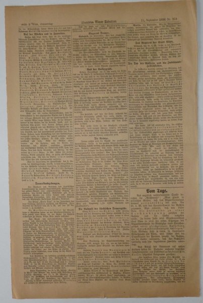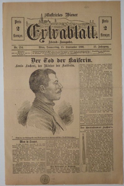 Kompletní noviny popisující atentát na císařovnu Sissi - vrah Lonis Lucheni