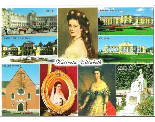 Barevná pohlednice, císařovna Sissi a její oblíbená místa