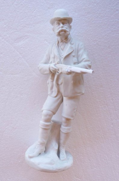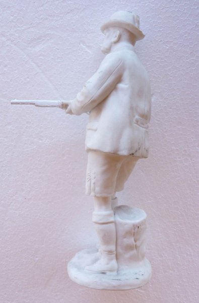 Bílá socha stojícího Františka Josefa v mysliveckém úboru a s puškou