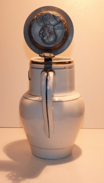 Bílý korbel se zlatými pruhy a s portrétem Franz Josefa na uzávěru