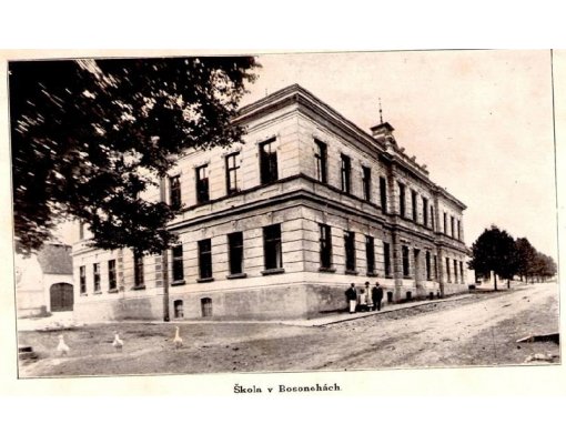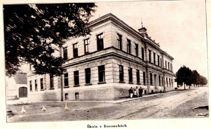 "Budova tato vystavěna byla nákladem obce Bosonožské 1907 za panování císaře a krále Františka Josefa I. a věnována vzdělání naší mládeže".
