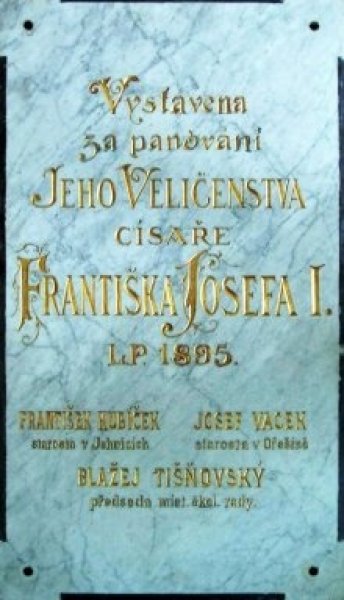Pamětní deska v jehnické škole byla odhalena v roce 1895. Signatura v pravém dolním rohu nás informuje, že mramorovou desku se zlaceným písmem textu zhotovil tehdy padesátiletý brněnský sochař a kameník Johann Tomola (1845-1907), autor řady dalších pamětních desek a pomníků, ale také tvůrce mnoha náhrobků na brněnských hřbitovech.