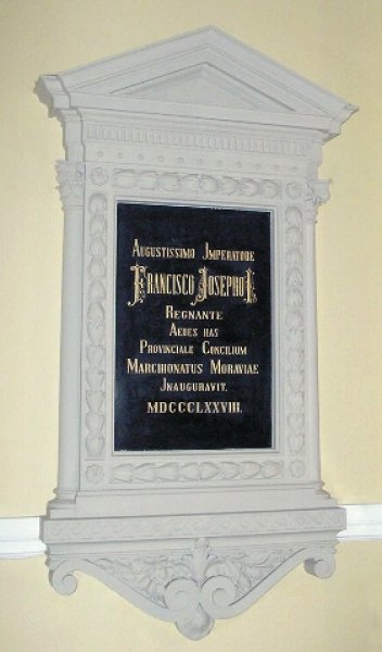 Pamětní deska je ve vstupní hale z České ulice. Je z leštěné černé žuly s rytým zlaceným nápisem, zasazena na výšku ve štukovém rámu. Deska byla po roce 1918 zakryta pravděpodobně omítkou a byla obnovena po roce 1989. Až do roku 2014 nebylo známo, že šikmo pod ní byla do zdi vložena schránka s dobovými dokumenty.