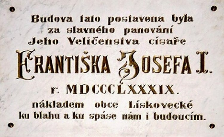 Pamětní deska císaře FJI z roku 1889 ve škole v Brně Starém Lískovci připomíná postavení školy.