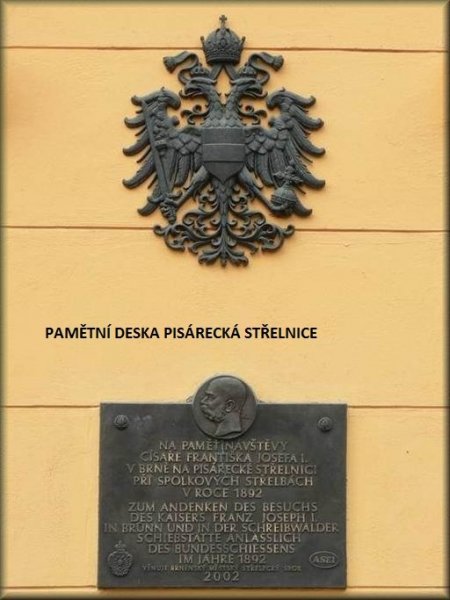 Pamětní deska na zdi restaurace pisárecké střelnice připomíná IV. rakouské spolkové střelby, které zahájil císař František Josef I v neděli 26.června 1892. Slavnostnímu zahájení spolkových střeleb předcházel výpravný průvod městem. Ceny pro střelce byly velmi bohaté. Vévodil jim stříbrný štít v rokokovém stylu od císaře, další cenou byl bohatě zlacený mistrovský pohár s postavou Austrie na víku nebo pozlacený pohár se znakem města Brna.