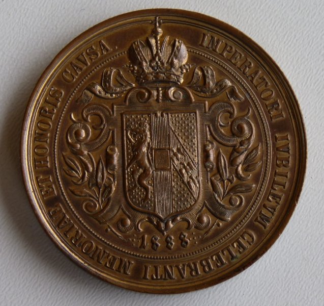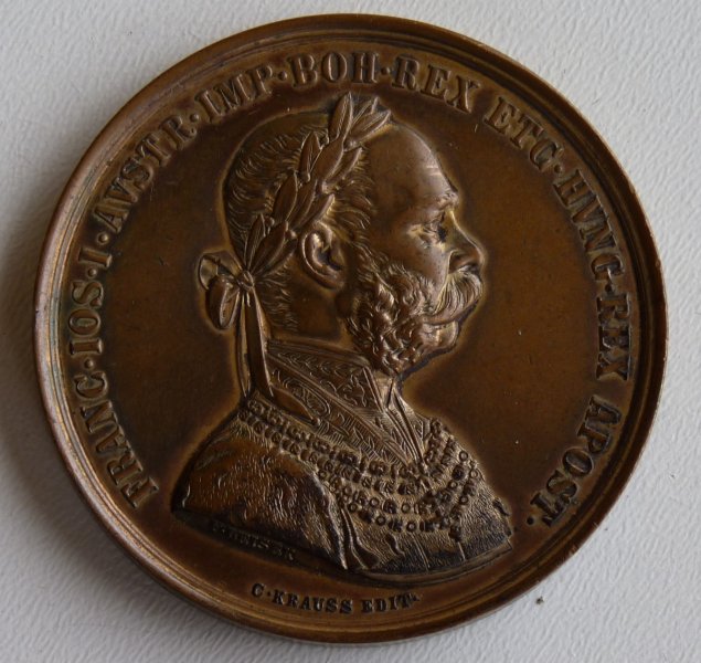 Bronzová medaile s Franz Josefem, rakouským erbem, korunou a rostlinným motivem