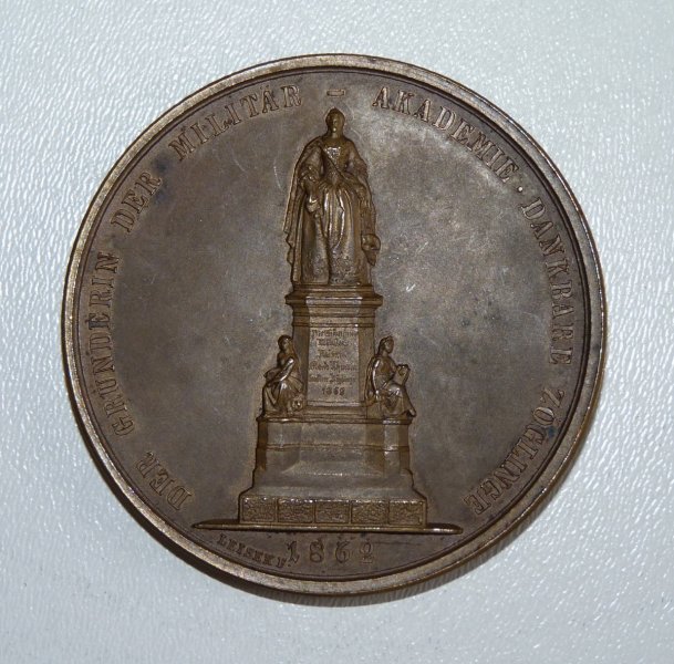 Bronzová medaile s Marií Terezií, památník na druhé straně