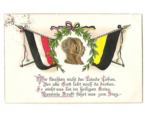 Bronzové miniportréty císařů Viléma a Františka Josefa s vlajkami státu