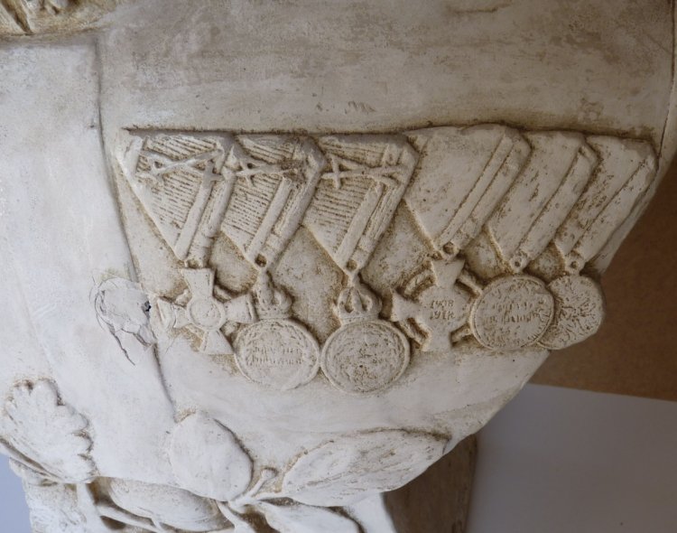 Busta rakouského důstojníka v uniformě s mnoha řády - hasičský útvar..? Busta před renovací a po opravě .