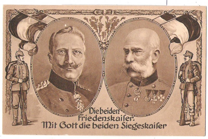 Černobílá pohlednice - portréty Františka Josefa a Viléma / vojáci vzdávající hold