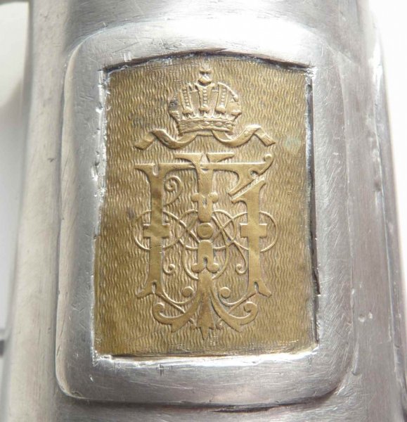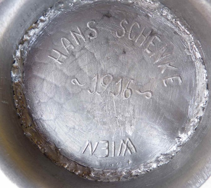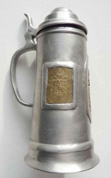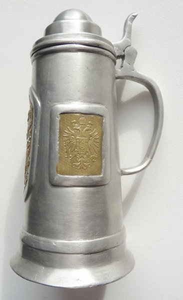 Cínový korbel - půllitr , ozdoba je použita z důstojnické známky - symboly FJI. a orli , výroba Hans Schenke / Wien 1916