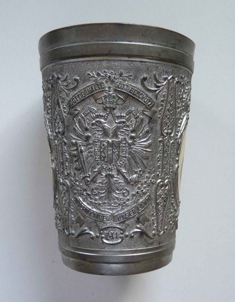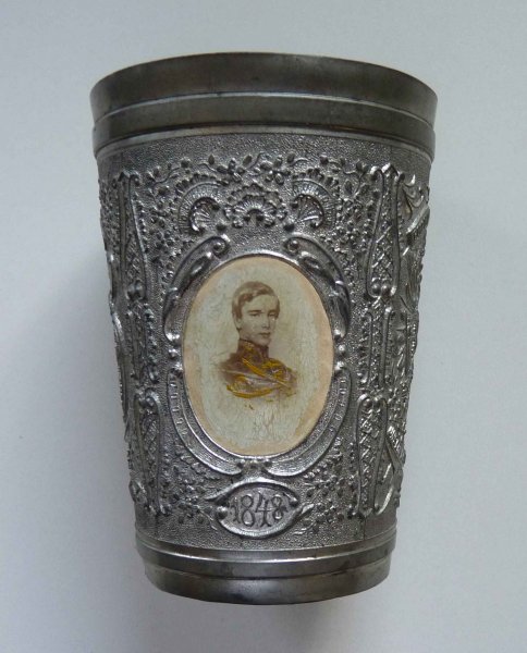 Cínový pohárek k 50 tému výročí vlády Franz Josefa - portrét mladého a starého Franz Josefa s originálními fotografiemi rok 1848-1898