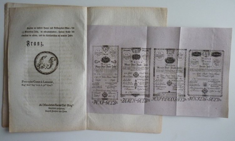 Cirkulář Františka II. k vydání bankovky 5, 10, 25, 50, 100, 500 a 1000 guldenů