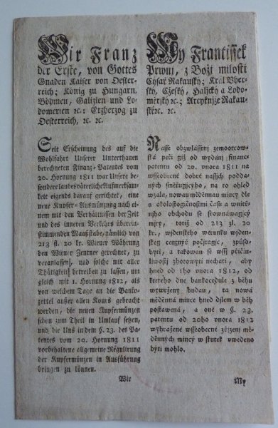 Cirkulář Františka Josefa I. k vydání mincí 1/4, 1/2, 1 a 3 Kreutzeru