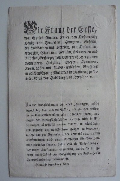 Cirkulář Františka Josefa I.- na vydání mincí 1/4, 1/2 a 1 Kreutzer