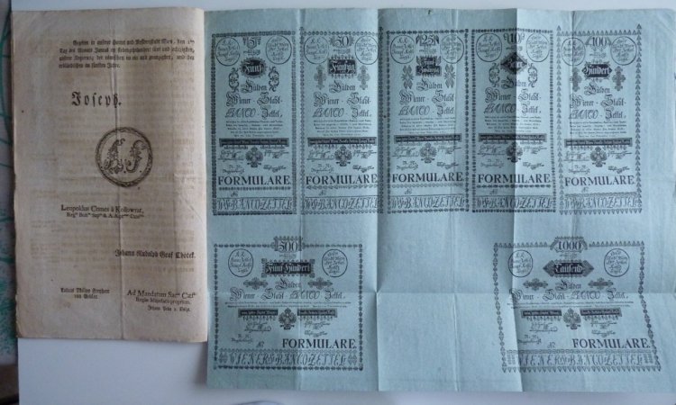 Cirkulář Josefa II. z r. 1771 na vydání obligací 5, 10, 25, 50, 100, 500 a 1000 guldenů