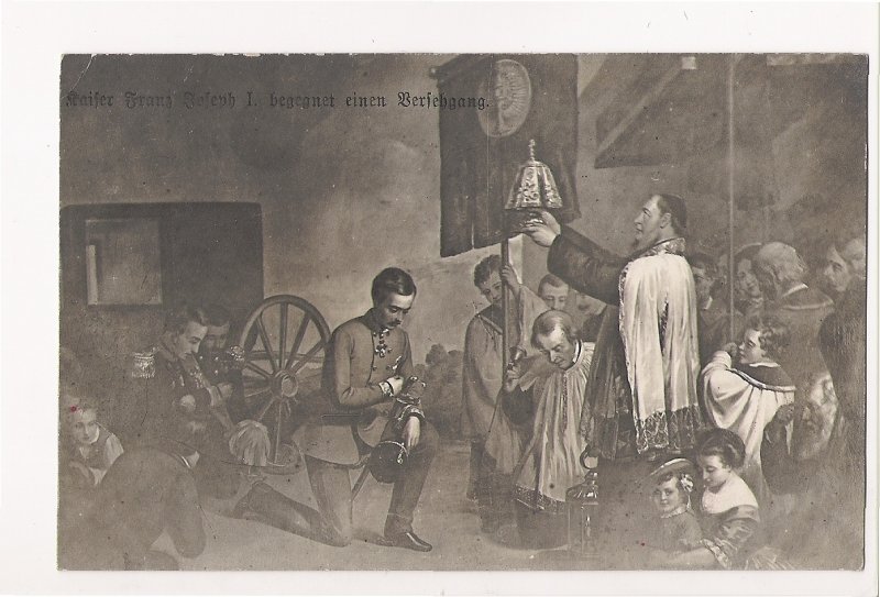 Císař Franz Josef klanící se průvodu s knězem