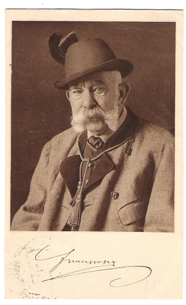 Další varianta Franz Josefa v mysliveckém úboru s podpisem