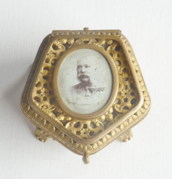 Dárek při tanečním bále - ballspende . Bylo to součástí vstupenky - uvnitř nějaký pamlsek či šperk pro dámu . Mimořádně zachovalý exemplář s portrétem císaře Franz Josefa .