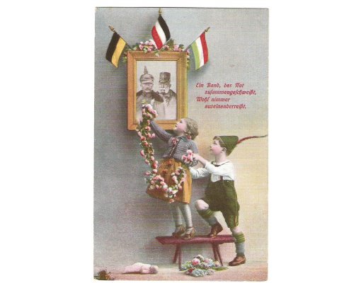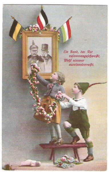 Děti chtějí na obraz Wilhelma a Franz Josefa připevnit kytice