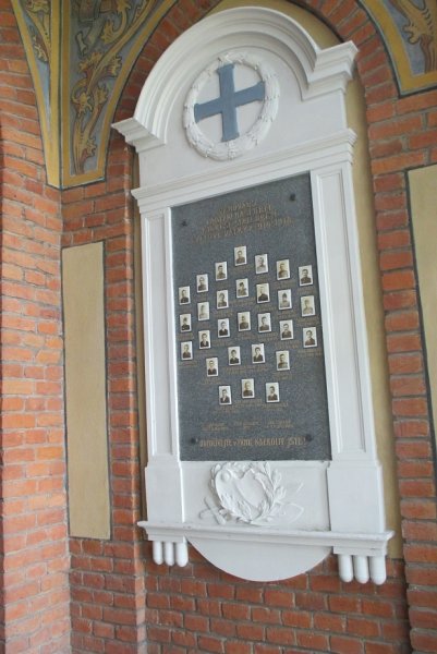 Po pravé straně vstupu do kostela (za mříží z tepaného železa) stála puvodně pamětní deska z r. 1908 s následujícím dvojjazyčným textem: