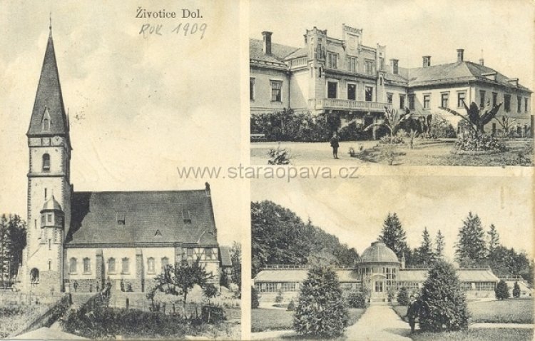 „Byl tento chrám páně vystaven a posvěcen. Životice léta Páně 1908."