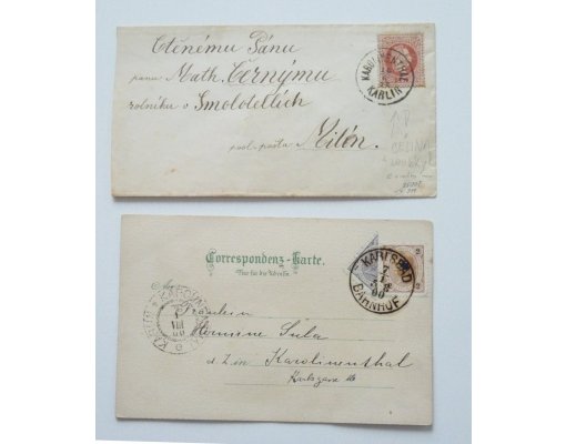 Dopis frankovaný výstřižkem z celiny 5 Kr a vysokými zoubky, pohlednice s půlenou 1 Kr plus 2 Kr