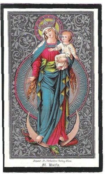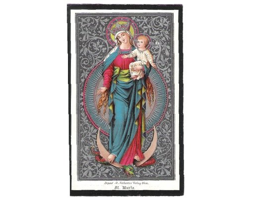 Druhá strana úmrtního lístku - barevný portrét Sv. Marie s dítětem