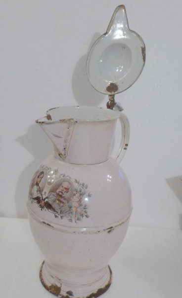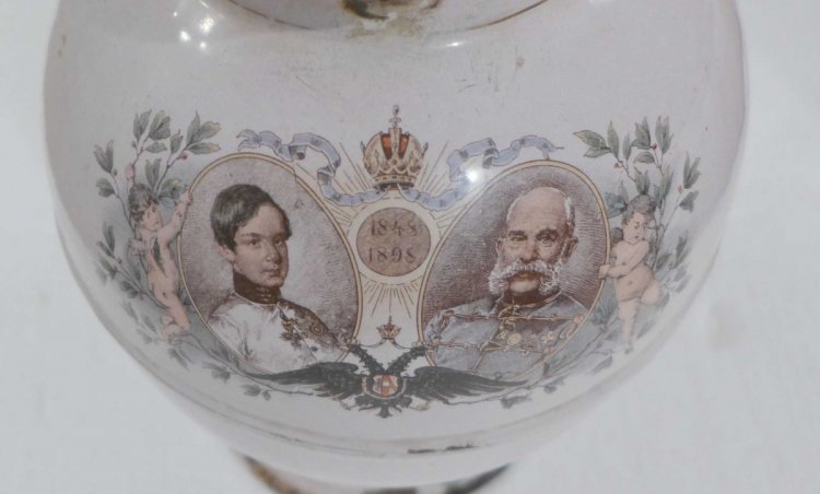 Smaltovaný džbán s víkem - portréty mladého a starého císaře Františka Josefa / mimořádné