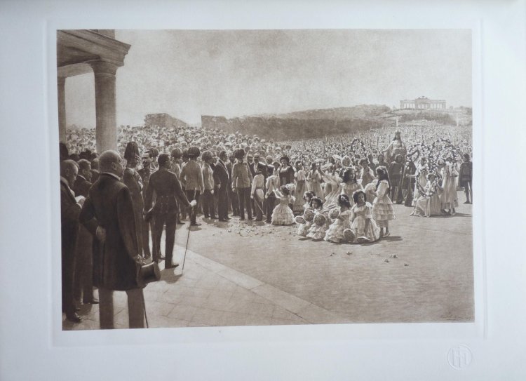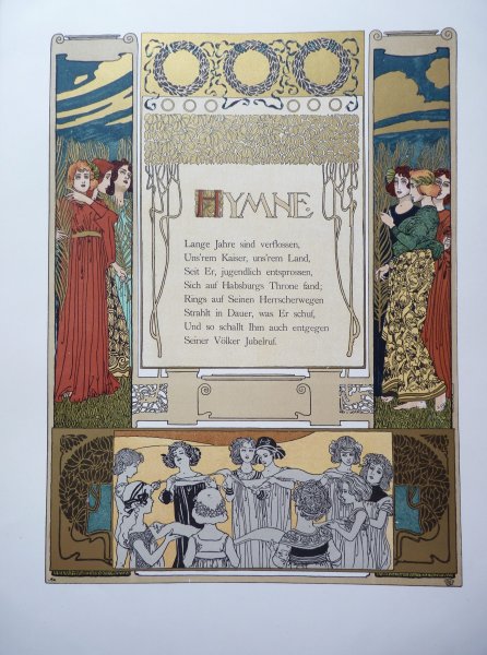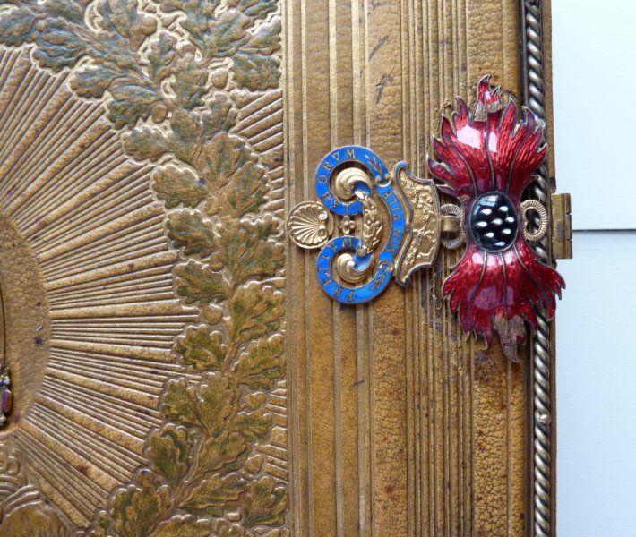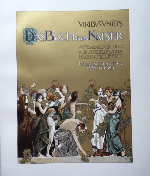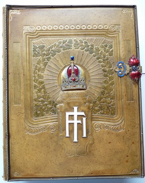 Excellent book - the glory of art books. Perhaps the gift of Franz Joseph. Many of thelithographs from the life of Franz Josef - unknown prints on parchment paper, whichthen (part only) were selected for mass produced books. Closing in the form of the Golden Fleece ... Only enamelled bronze replica - yet extraordinary. One of the bestexhibits in the museum. The book includes lithographs and many additional imagesand accompanying texts.