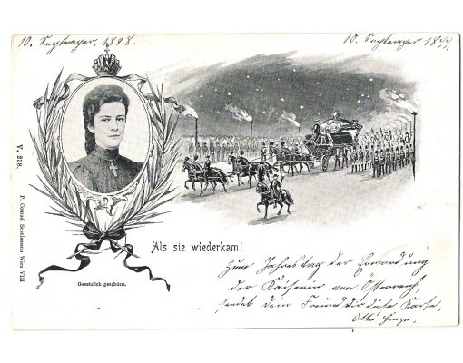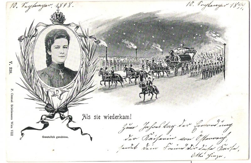There is funeral parade for empress Elisabeth with her portrait on the postcard