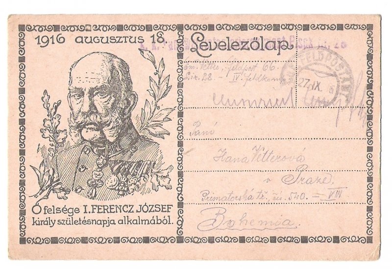 Hungarian field postcard - Franz Joseph in a decorative frame (2) © 2012 franz-josef.cz; realized KETNET Ltd. (website, e-shop, web presentations), hosted and operated by CMS Modeline MODElina, connected to the network TaNET